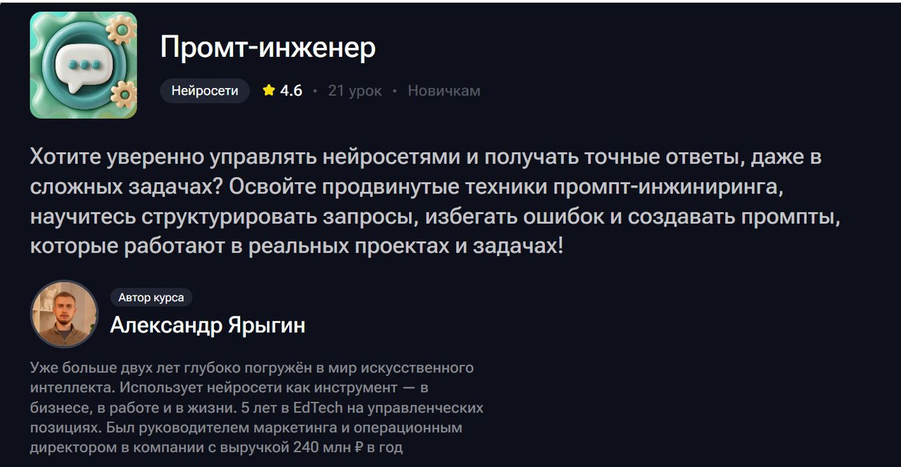 Александр не теоретик, который изучил тему по статьям. Он использует нейросети в бизнесе, в работе, в повседневных задачах — каждый день. Его подход: не "вот как может быть в идеальном мире", а "вот как работает у меня и у сотен моих учеников прямо сейчас".